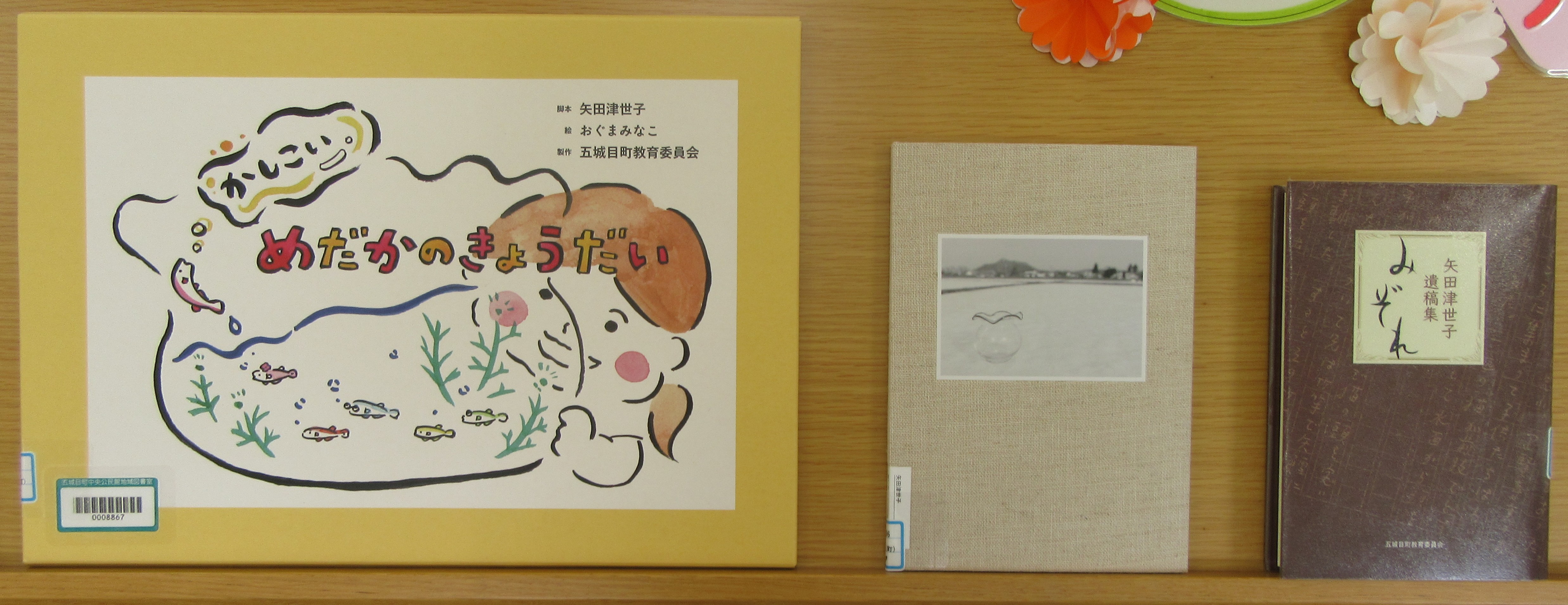 五城目町出身の作家・矢田津世子の未発表とみられる童話「賢いめだかの兄弟」の絵本と紙芝居が、地域図書室わーくるで配架されました。