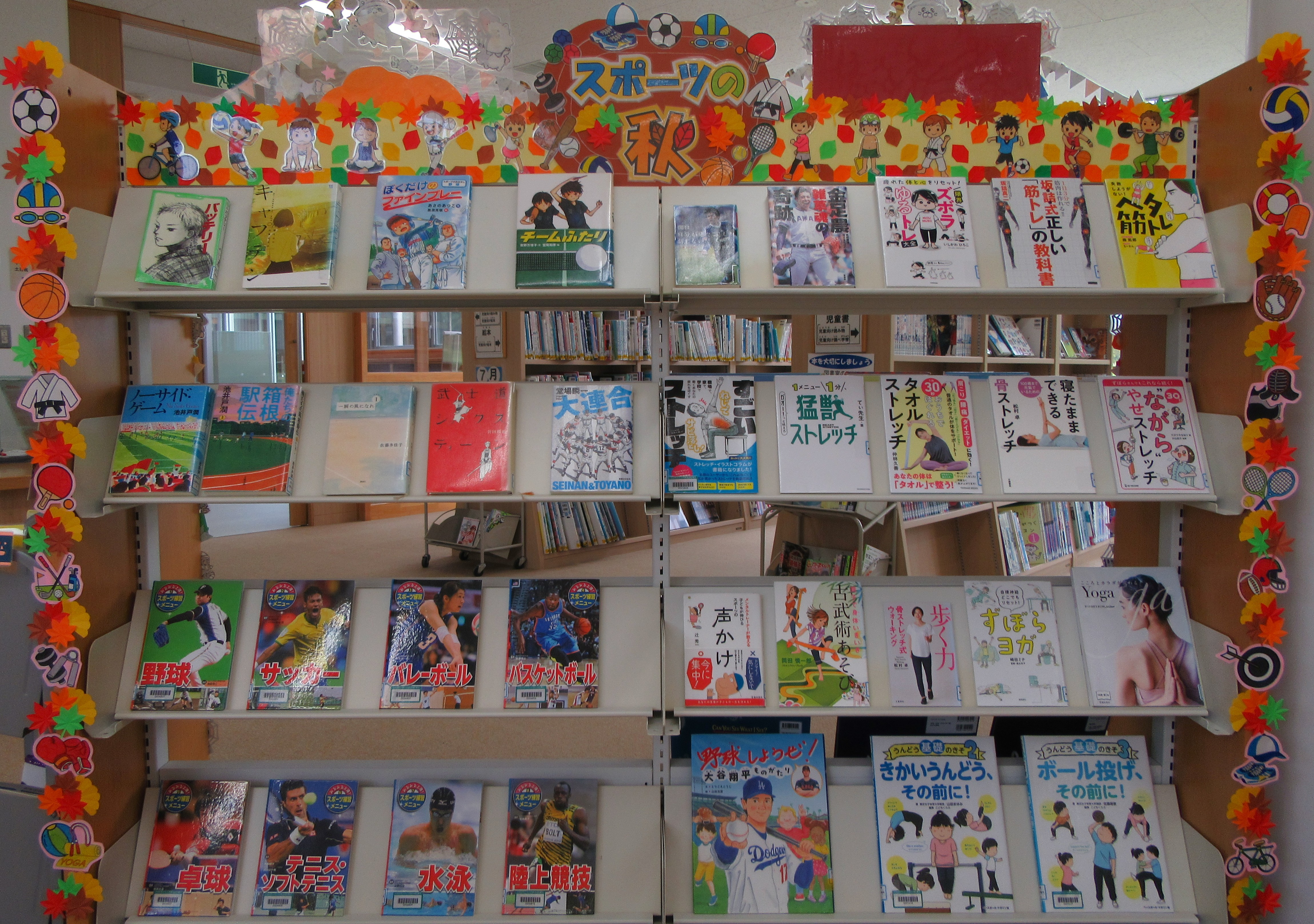 今は運動には最適な季節。スポーツの秋を楽しめるような本を展示いたしましたので、ご覧ください。