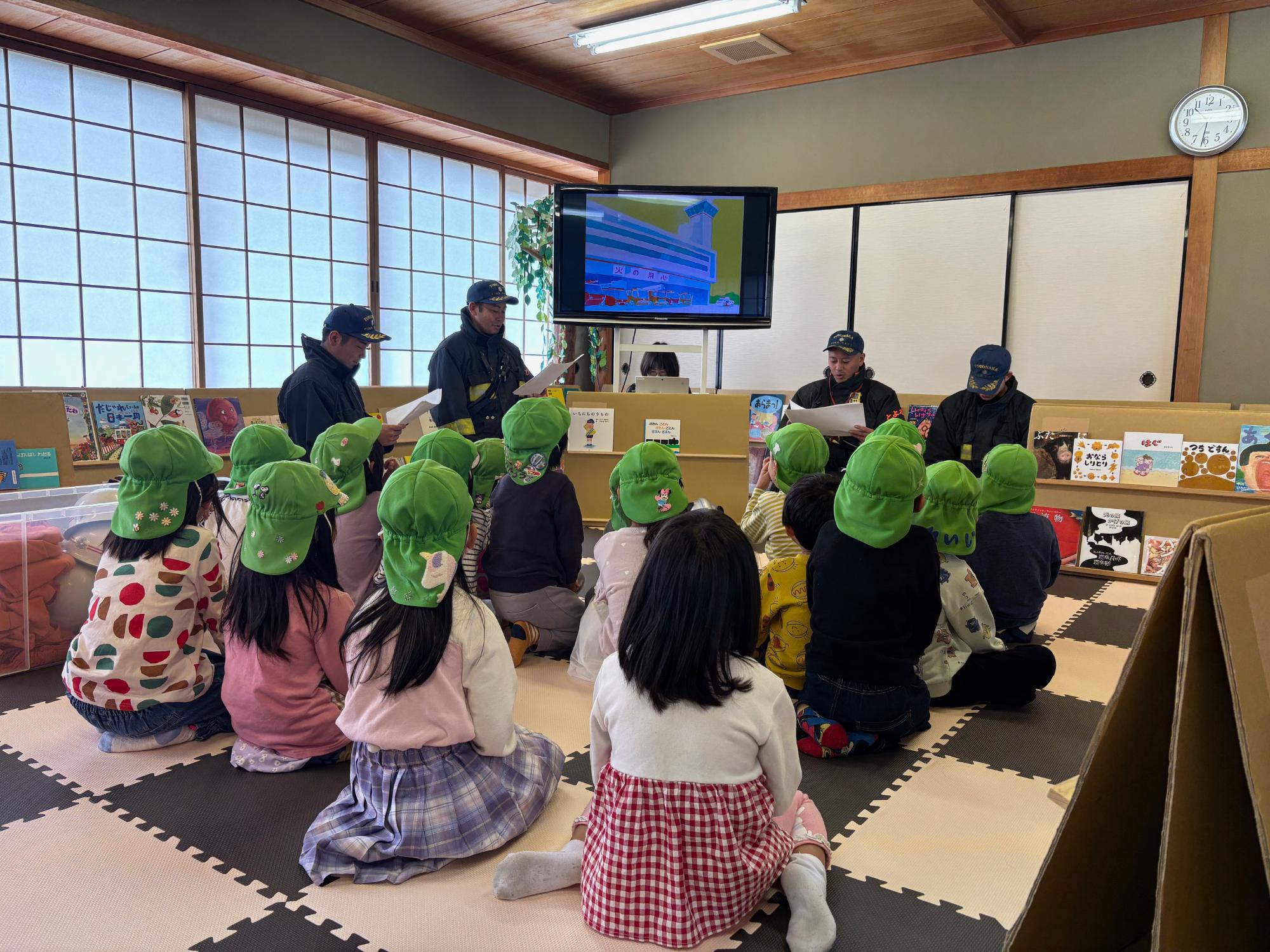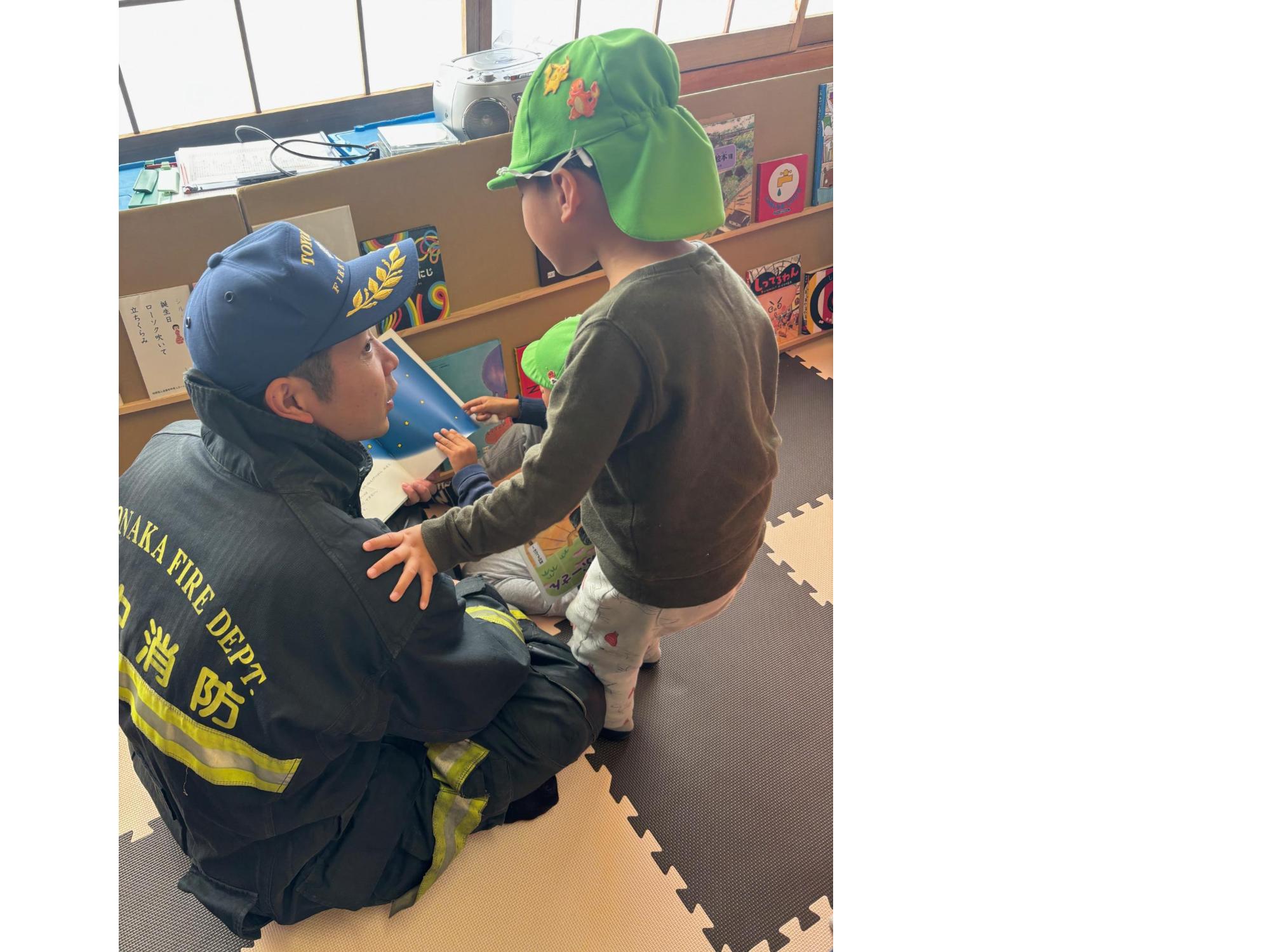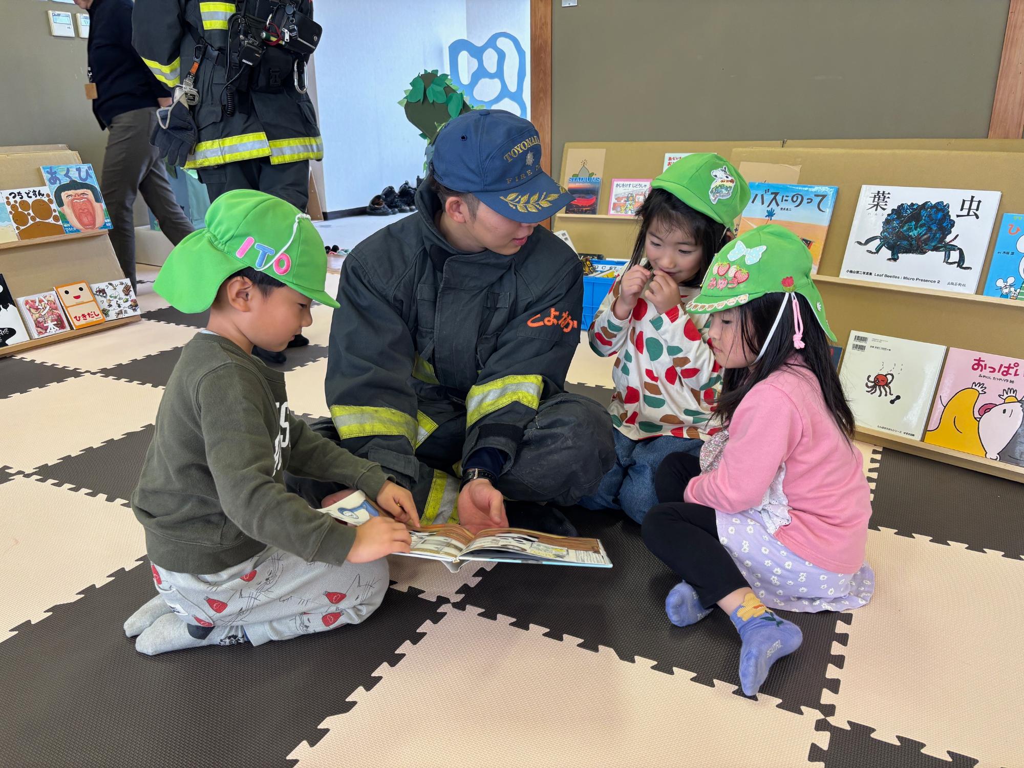 たくさんのこどもが、豊中市北消防署能勢町分署に貸していただいた『子ども防火服』と「子ども救命服」を着用し、記念撮影を楽しむ姿も見られました。また、11月7日(金曜日)は、消防士さんによる紙芝居の読み聞かせがあり、子どもたちの笑顔があふれる、にぎやかなひとときとなりました。