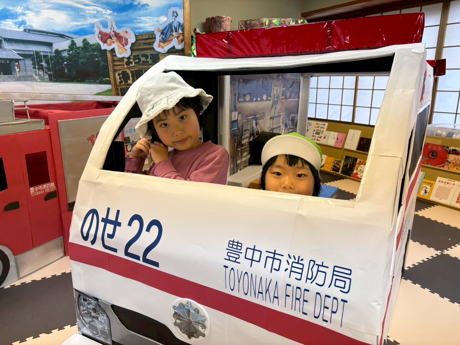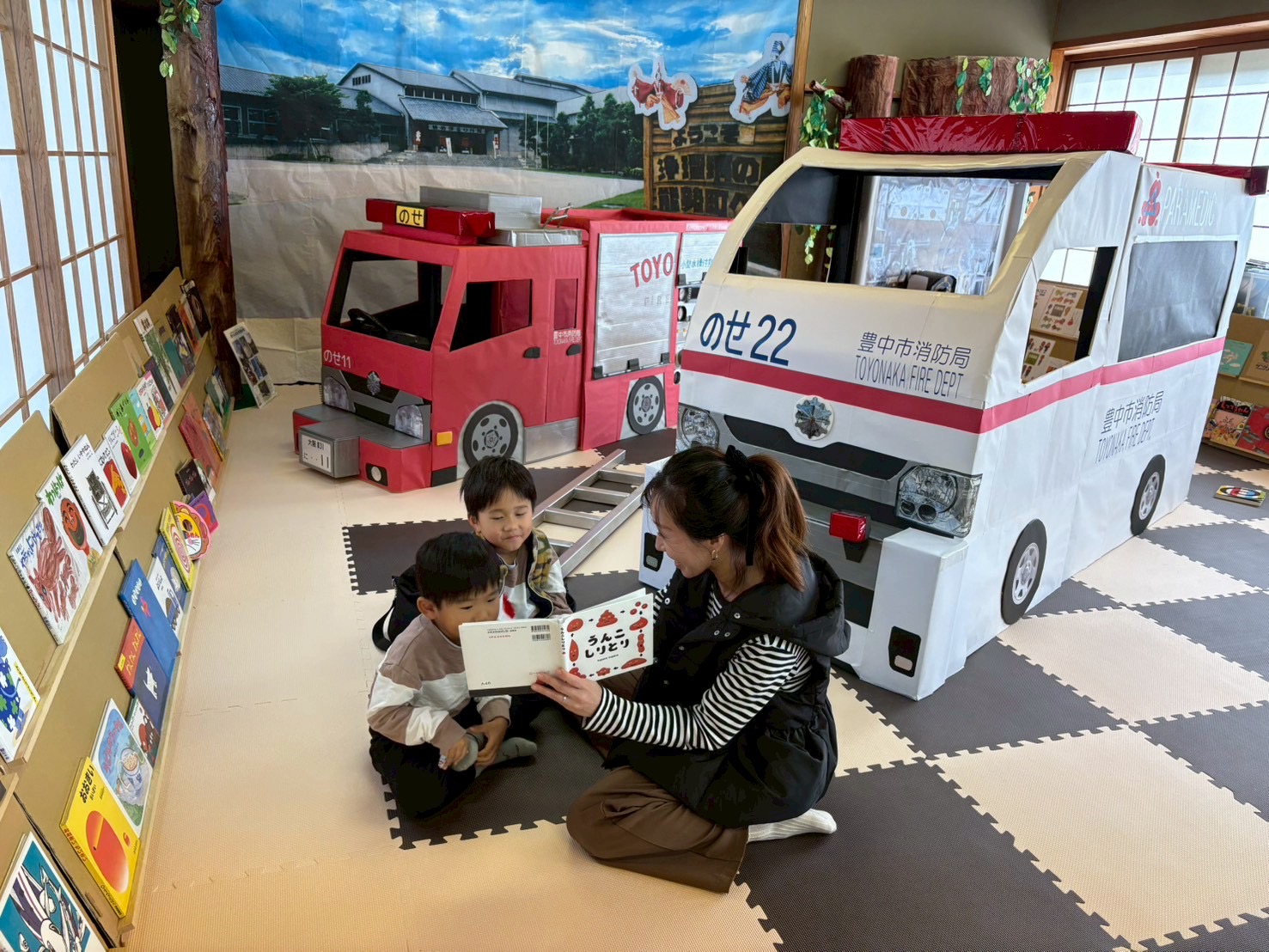 絵本に親しむためのきっかけづくりとして、手作り消防車と救急車のフォトスポットや緊急時に役立つ「こんなときどうする?クイズ」を企画しました。参加した子どもは「知らんかったぁ覚えとこう」という声や「これは知ってるで!教えてあげる」と子ども同士で話をしながらとても楽しんでいただきました。