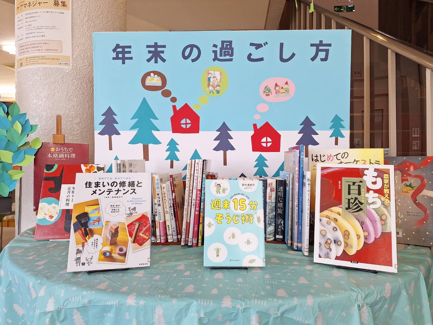 図書室の入口に毎月テーマを決めた展示コーナーを設置しています。 12月の展示テーマは「年末の過ごし方」です。 今年も残りわずかとなりました。12月は「師走」と呼ばれるように、何かと忙しい時期です。大掃除をしたり、イベントを楽しんだり、新年を迎える準備をしたり・・・。 この時期ならではの過ごし方に役立つ本を集めてみました。 皆さまの図書室のご利用を心よりお待ちしています。