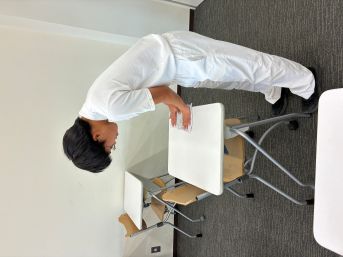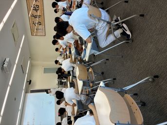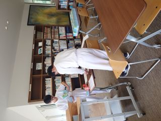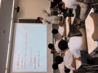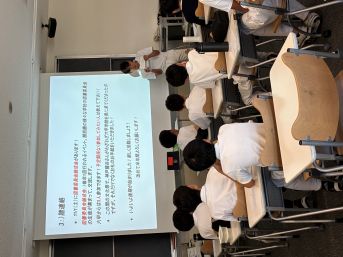 高校生の先輩(本日はボランティア)が、中学生の新しい委員に返本伝授