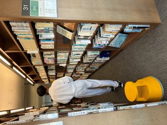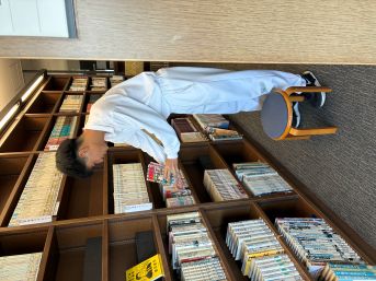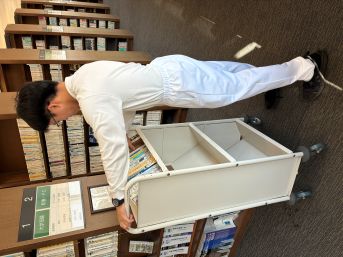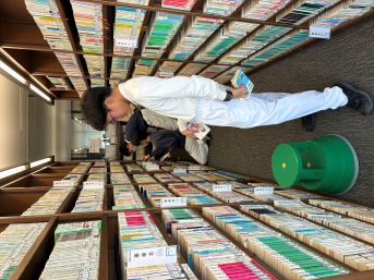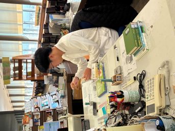 二人組の仕事は返本じゃなくって、展示用の本を集めてます