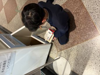 放課後、廊下の図書返却BOXを開けて本の回収をする図書委員
