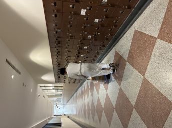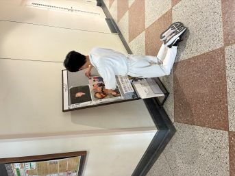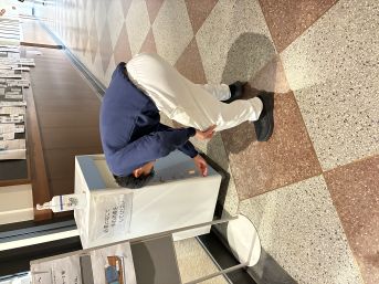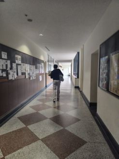 廊下を遠ざかっていくのは・・・1階東・西広場へ、新刊案内を張替えに行く委員(=゚ω゚)ノイッテラー