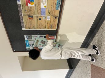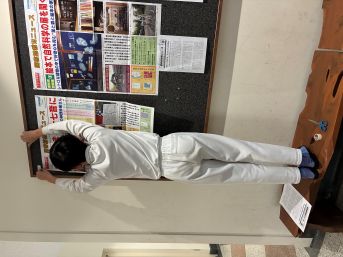 廊下の新聞ニュースを貼りかえる委員と・・・