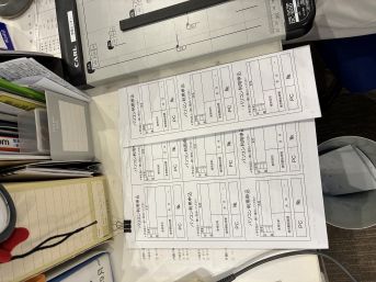 天地印をつく委員、向かいでは班長が急遽用紙の裁断中・・・Σ(・ω・ノ)ノ!イソガネバ